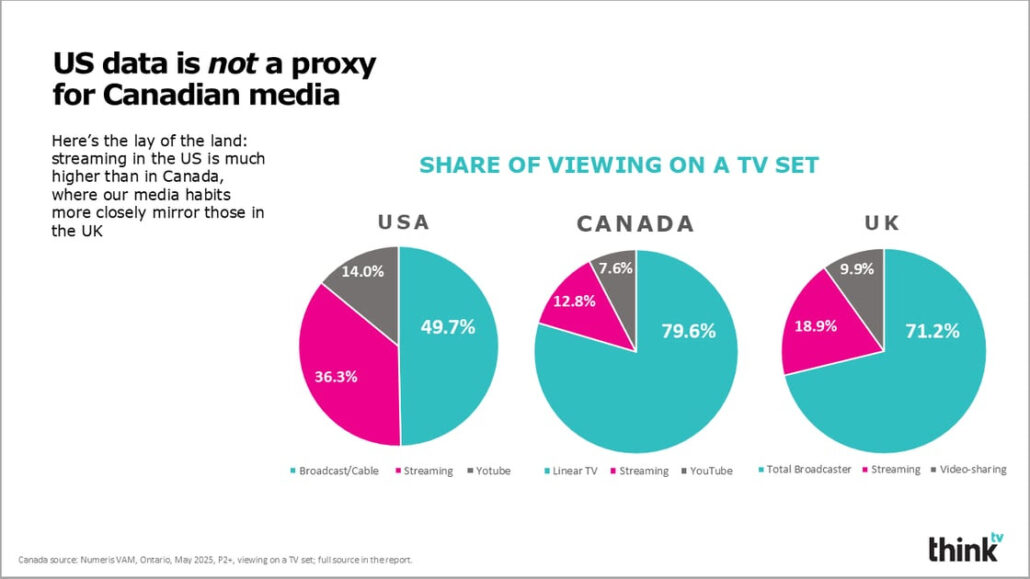 Thinktv has released its Total TV & Streaming Viewership report for spring 2025. Key takeaways include that very few Canadians are “only streamers” with most watching TV and streaming services. Total TV surpasses YouTube and the combined viewership of all streaming services across all key demos (A18+, A25-54, and A18-34), with TV’s percentage of time spent with video going up over the past year, while YouTube went down. The report also emphasizes that Canadians stream differently than Americans. Streaming is far more prevalent in the U.S., where streaming makes up 50% of viewing on a TV set. In Canada, that number is just 21%, with almost 80% going to linear TV, a viewing pattern that is similar to the UK.